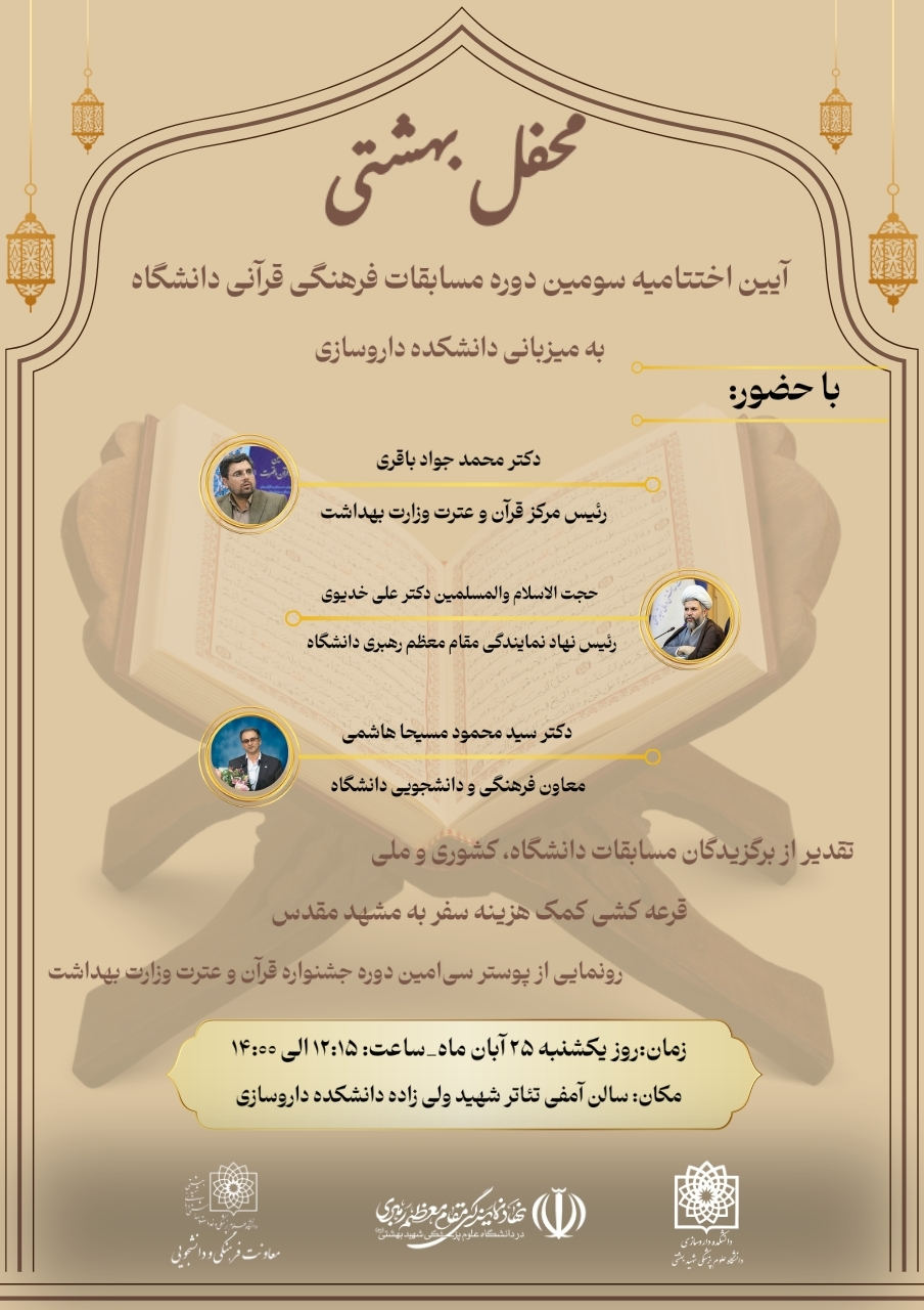به اطلاع کلیه اساتید محترم، کارکنان و دانشجویان عزیز می رساند برگزاری سومین دوره مسابقات فرهنگی قرآنی دانشگاه علوم پزشکی شهید بهشتی با محوریت "شهدای وطن" به مناسبت هفته قرآن و عترت در سالن آمفی تئاتر شهید ولی زاده واقع در دانشکده داروسازی برگزار می گردد.