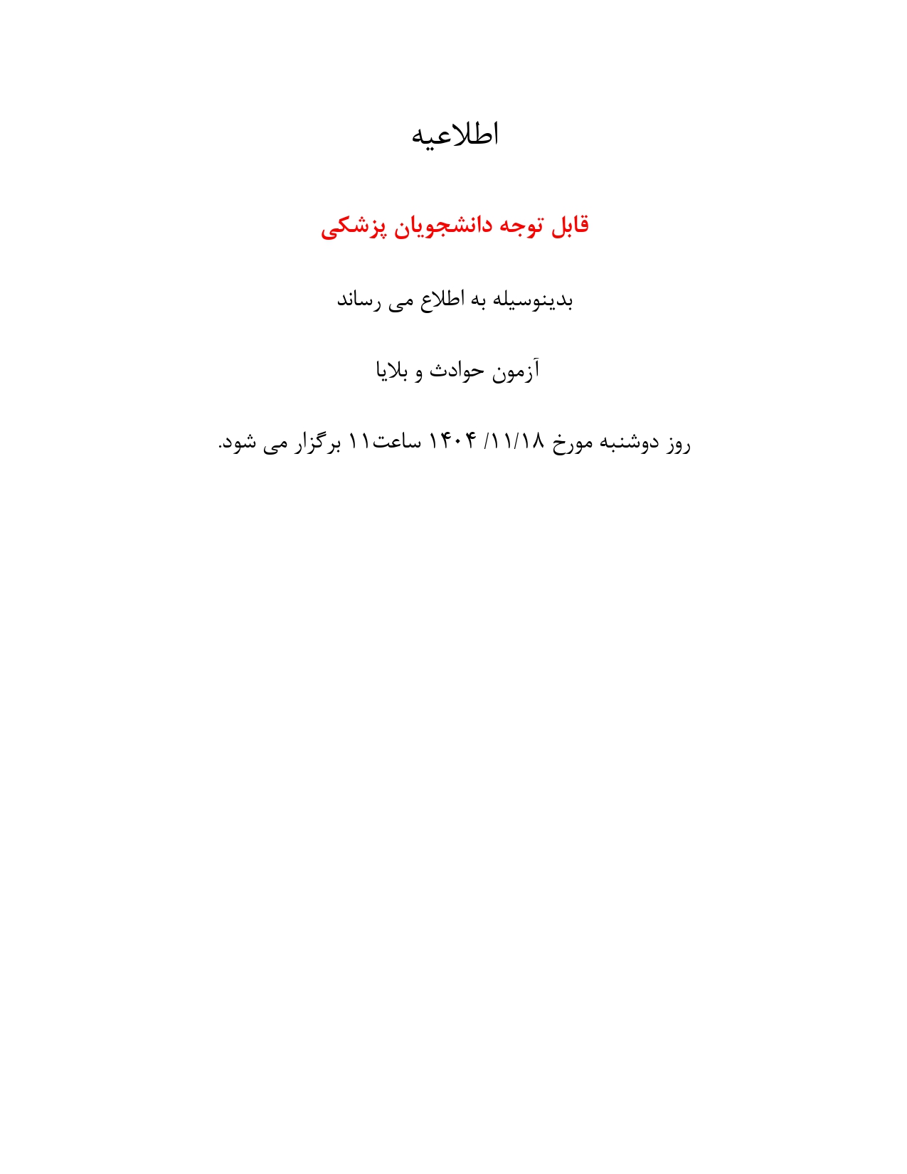 اطلاعیه آزمون حوادث و بلایا - قابل توجه دانشجویان پزشکی اطلاعیه آزمون حوادث و بلایا - قابل توجه دانشجویان پزشکی گروه خبری : آرشیو اخبار,اطلاعيه ها کد خبر : 164843 لینک کوتاه کلید واژه