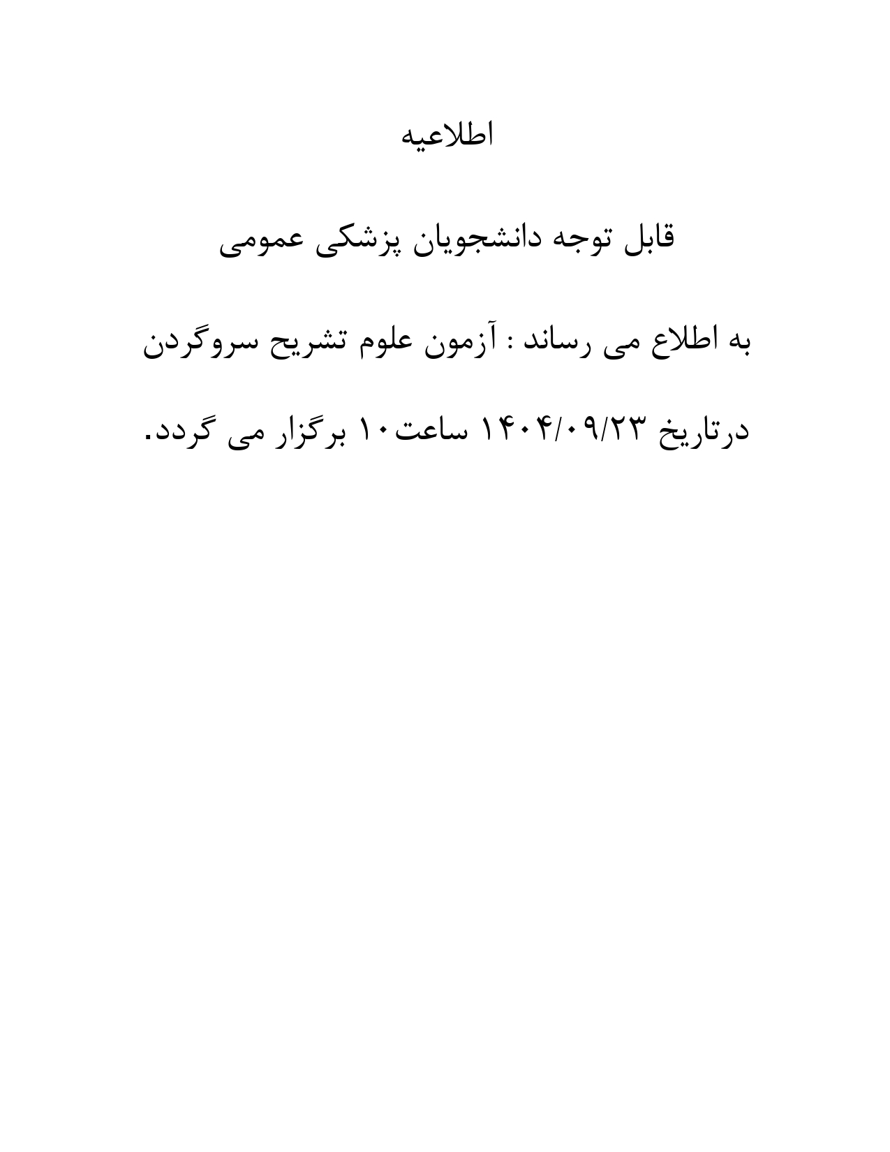 اطلاعیه آزمون علوم تشریح سر وگردن - قابل توجه دانشجویان پزشکی عمومی