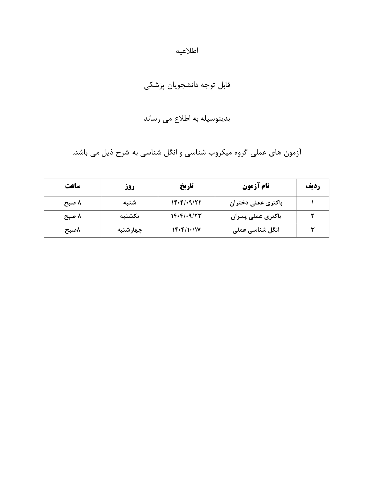 اطلاعیه آزمون های عملی گروه میکروب شناسی و انگل شناسی - قابل توجه دانشجویان پزشکی اطلاعیه آزمون های عملی گروه میکروب شناسی و انگل شناسی - قابل توجه دانشجویان پزشکی گروه خبری : آرشیو اخبار,اطلاعيه ها کد خبر : 163597 لینک کوتاه کلید واژه