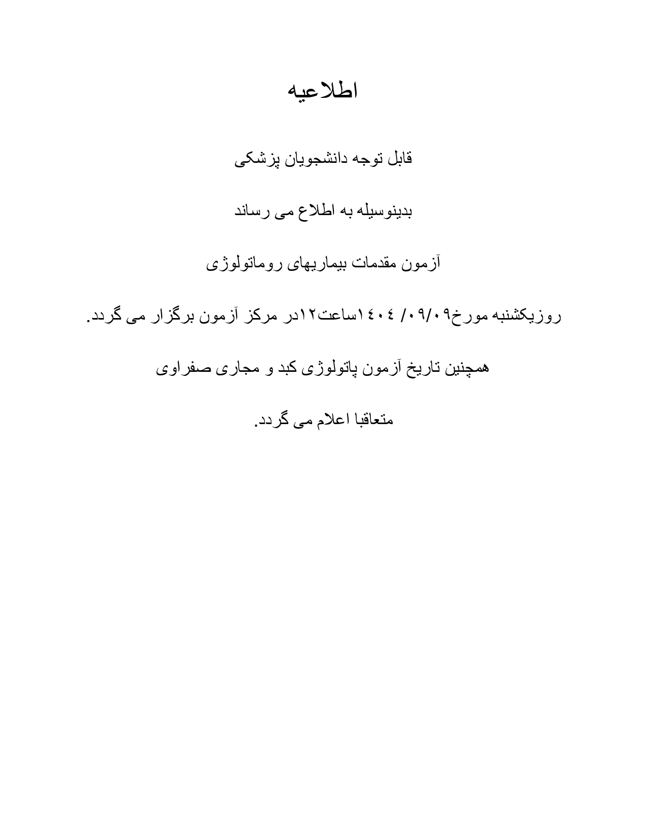 اطلاعیه درخصوص آزمون مقدمات بیماریهای روماتولوژی و آزمون پاتولوژی کبد و مجاری صفراوی
