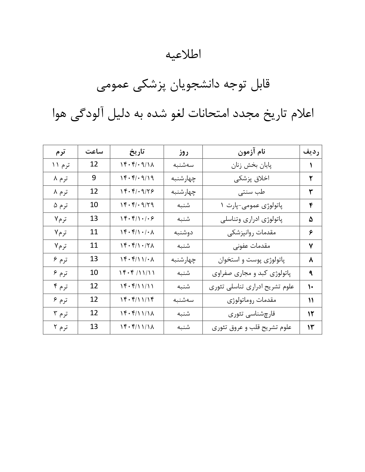 اطلاعیه - اعلام تاریخ مجدد امتحانات لغو شده به دلیل آلودگی هوا - قابل توجه دانشجویان پزشکی عمومی