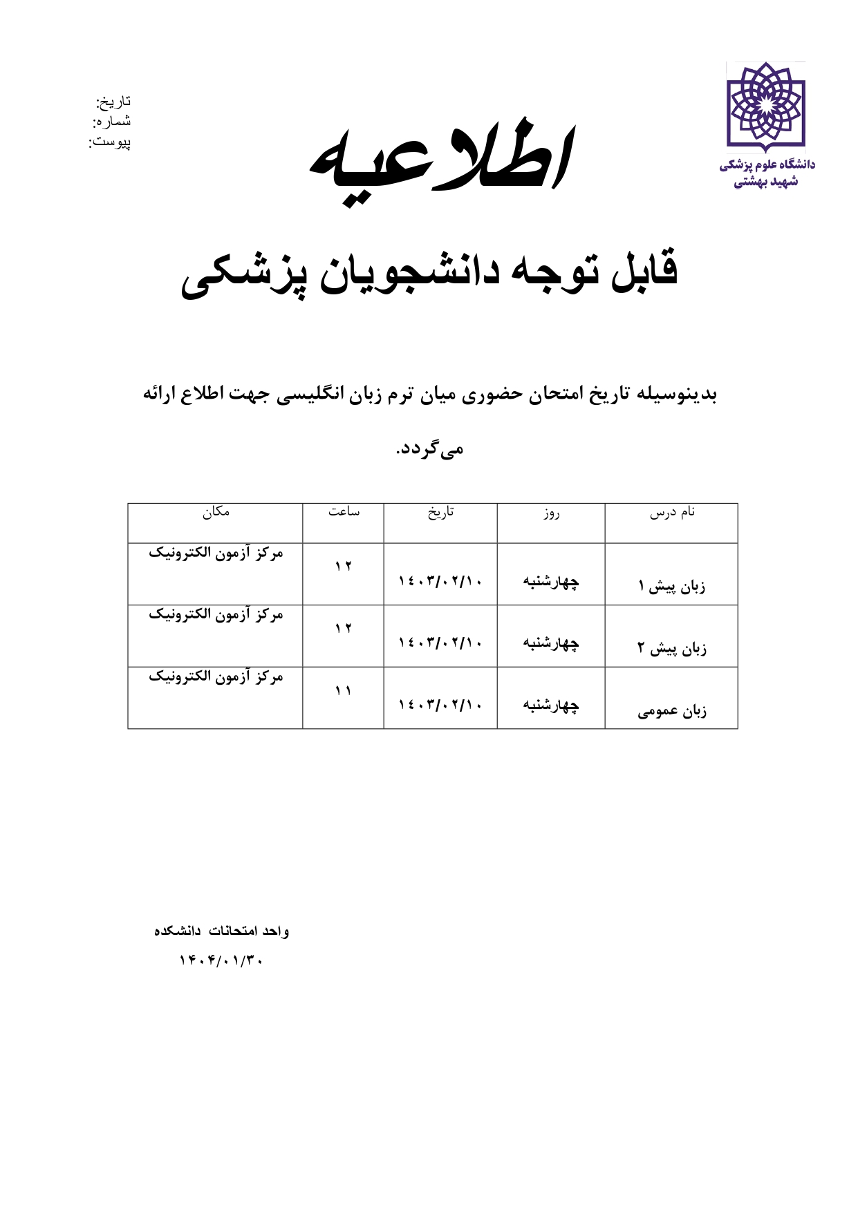 تاریخ امتحان حضوری میان ترم زبان انگلیسی - قابل توجه دانشجویان پزشکی